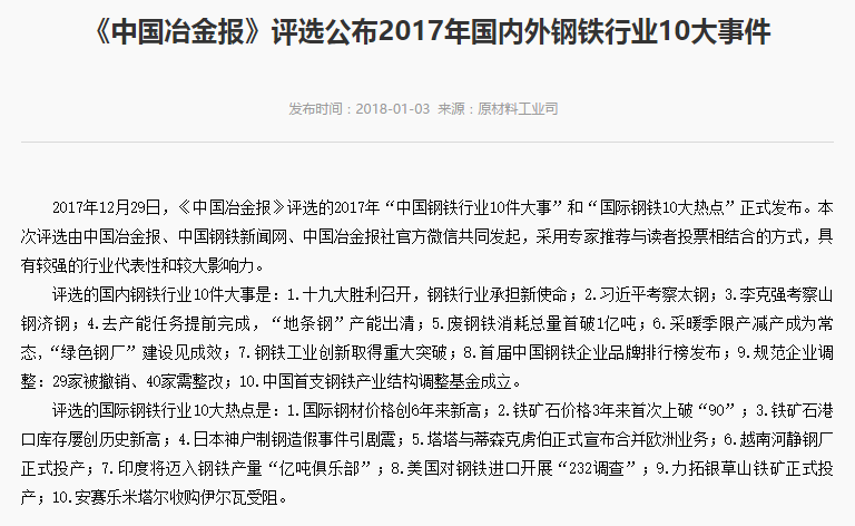 2018年1月3日,工业和信息化部在官网上刊出《<中国冶金报>评选公布2017年国内外钢铁行业10大事件》一文,对《中国冶金报》评选的2017年“中国钢铁行业10件大事”和“国际钢铁10大热点”进行了介绍。